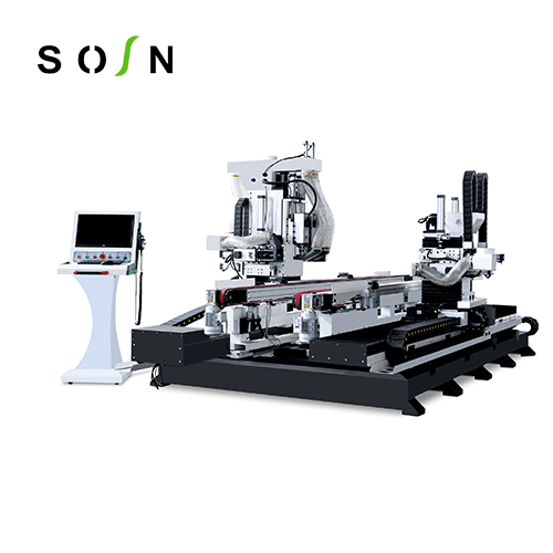 功能:門扇鎖、合頁等五金件安裝孔、槽的加工。特點(diǎn):自動(dòng)對(duì)刀功能,保證換刀,斷刀更換時(shí)的加工精度。 主軸正反旋設(shè)計(jì)銑削,確保加工不崩邊,崩角,提高加工質(zhì)量。 門扇鎖孔,合頁兩側(cè)同時(shí)加工,提高生產(chǎn)加工的效率。 真空吸附平臺(tái),自動(dòng)測(cè)寬,測(cè)厚功能,滿足不同寬度,厚度門扇的精確